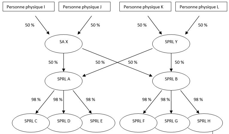 Les actions de la SPRL A et la SPRL B sont, à leur tour, détenues pour moitié par la SA X et pour moitié par la SPRL Y et elles sont contrôlées conjointement par ces deux dernières sociétés. La SPRL A a un seul gérant : la personne physique I, et la SPRL B a pour seul gérant la personne physique K.
